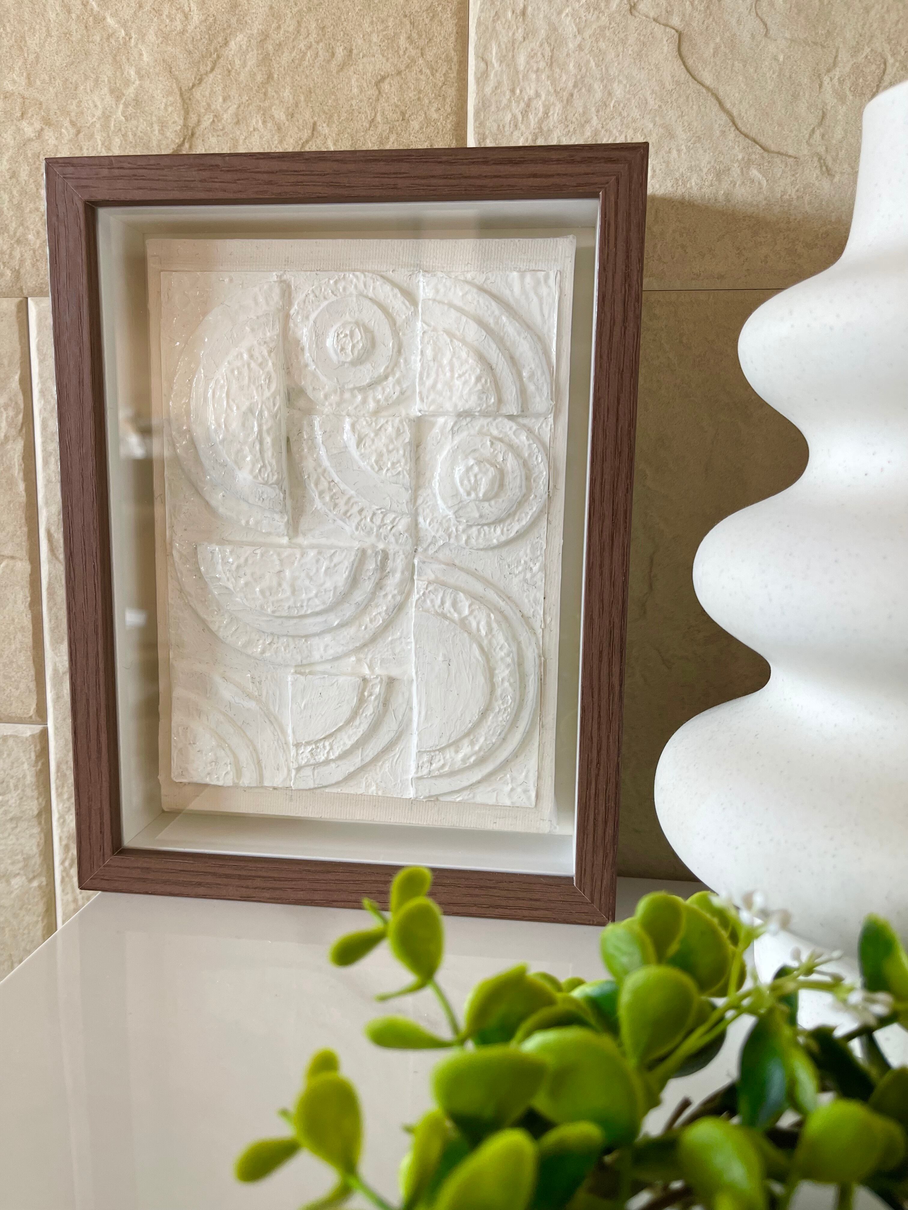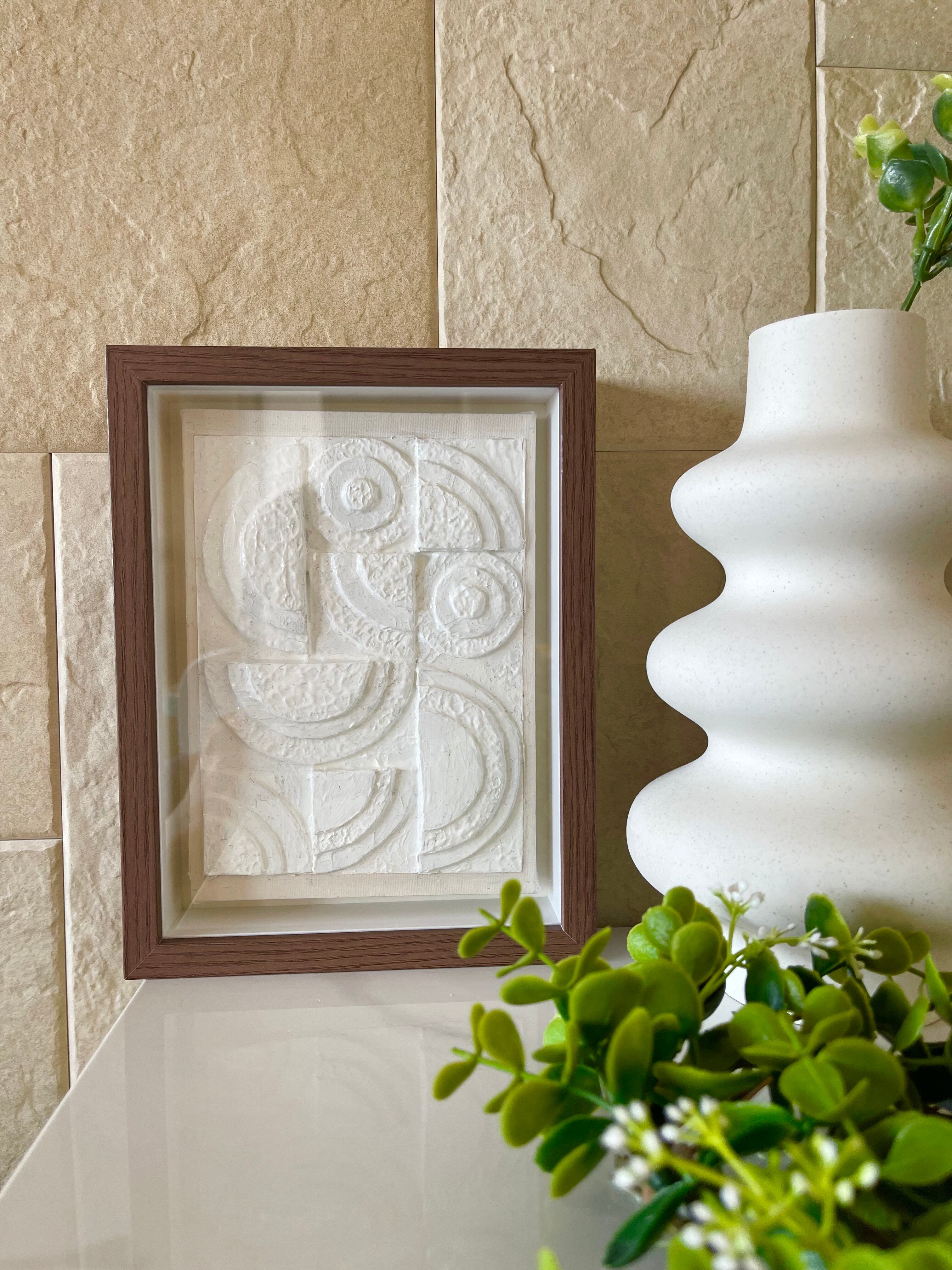 composition rectangle No.7は、重なり合う円の形を遊び心を持って構成した可愛らしい作品です。柔らかな色合いが空間の余白をおしゃれに演出します。小さなスペースにも似合うシンプルさです。この作品は、リビングルームや寝室はもちろん、オフィススペースでも洗練された雰囲気を演出し、モダンな空間を提供します。